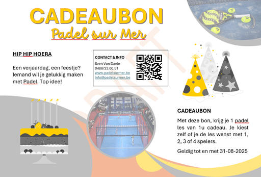 Les bij uw eigen club is uiteraard ook mogelijk mits toestemming van de club. CADEAUBON? Wil je iemand verrassen met een padel les? Dat kan. Alle bedragen zijn mogelijk. De bonnen zijn altijd voor max 4 personen. Dus tot 4 maal FUN. Inclusief huur terrein gedurende anderhalf uur. voorbeeld: Initiatie 45 min: € 45 - 1 uur les: € 55 |